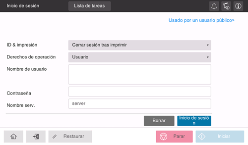Si el acceso de usuario público (usuarios no registrados) está activado, puede tocar [Usado por un usuario público] en la pantalla de inicio de sesión para utilizar la máquina sin autenticación.