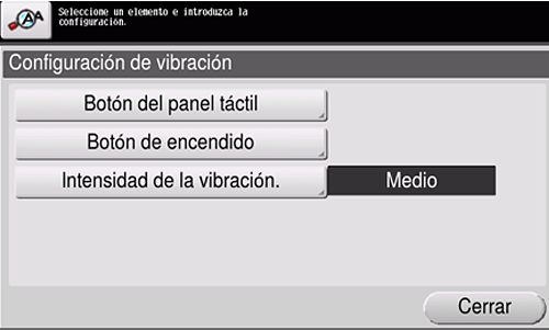 [Intensidad de la vibración] | Permite especificar la intensidad de la vibración cuando se pulsa una tecla en el panel táctil o la tecla Energía (predeterminado: [Medio]). Si toca la tecla de configuración de intensidad de la vibración, puede confirmar la intensidad que se debe aplicar. |