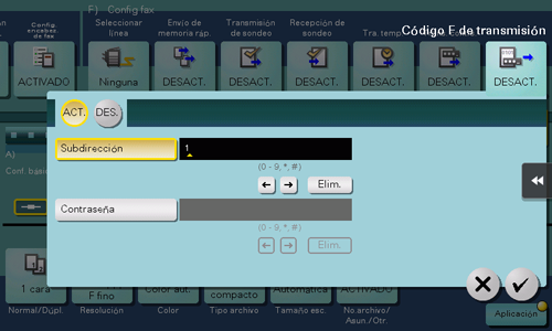 [ON]/[DESACT] | Seleccione [ON] para definir el código F de transmisión. |