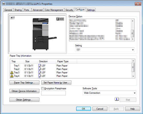 Geben Sie auf der Registerkarte [Konfiguration] anhand des Druckertreibers die auf diesem System installierten Zubehörkomponenten, die den einzelnen Papierfächern zugewiesenen Papiertypen sowie andere Informationen an. Sie können automatisch Informationen dieses Systems abrufen, um Einstellungen einzurichten und manuell zu registrieren.