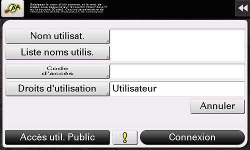 Si Accès util. Public (utilisateurs non enregistrés) est activé, appuyez sur [Accès util. Public] pour vous connecter à cette machine.