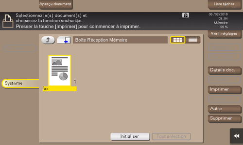 Le fax est imprimé et automatiquement supprimé de la Boîte Réception Mémoire.