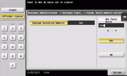 Tapez sur [Oui], entrez le mot de passe pour traiter les fax enregistrés dans une boîte à l'aide du clavier, puis tapez sur [Valider].