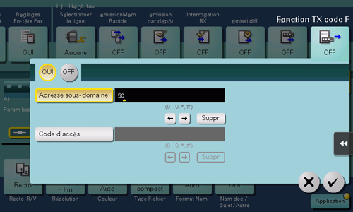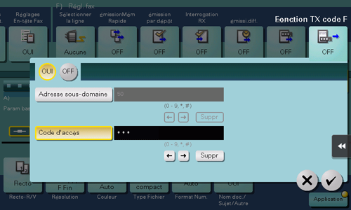 Tapez sur [OUI] et entrez le numéro de Boîte Confidentielle sur la machine de destination dans [Adresse sous-domaine], à l'aide du clavier.