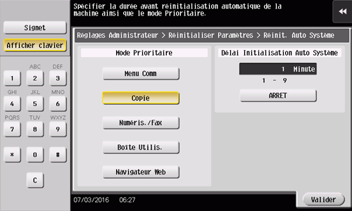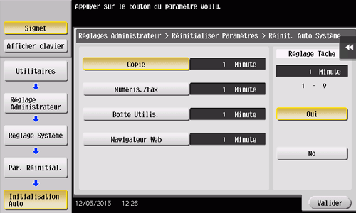 Sélectionnez les fonctions à afficher après la réinitialisation et entrez le temps nécessaire avant restauration des réglages par défaut en vous aidant du clavier.