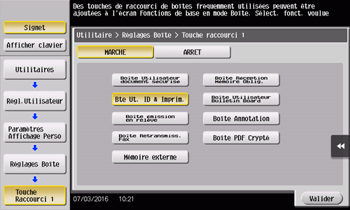 Sélectionnez [MARCHE] ainsi que le réglage à afficher comme touche de raccourci, puis tapez sur [Valider].