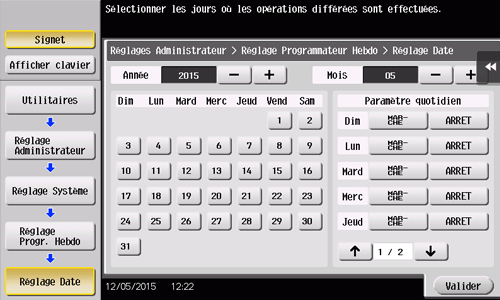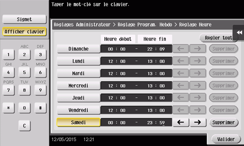 Sélectionnez un jour de la semaine pour lequel vous voulez définir le programmateur hebdomadaire, entrez les horaires d’activation et de désactivation sur le clavier, puis tapez sur [Valider].