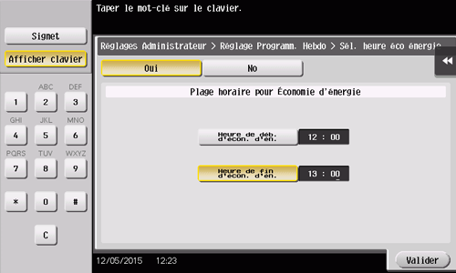 Tapez sur [Oui], entrez la période de passage en mode d'économie d'énergie sur le clavier, puis tapez sur [Valider].