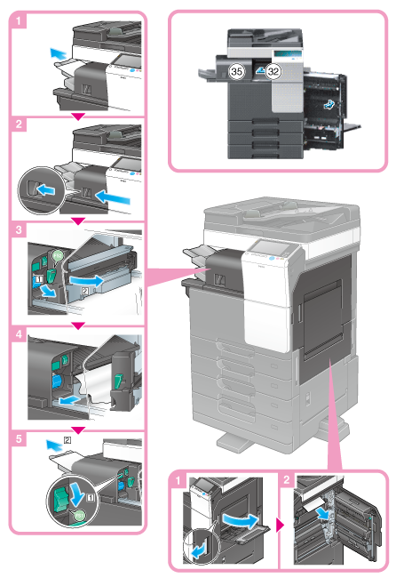 Sections inside the finisher prone to paper jams vary depending on the settings for [Finishing].