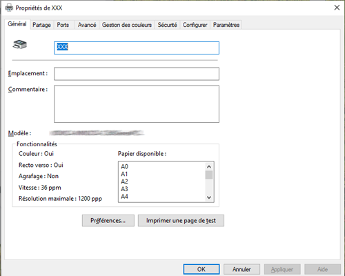 Windows fournit la fonction d'impression d'essai. Réalisez une impression test pour vérifier que l'impression est correcte.