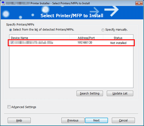 Sélectionnez cette machine dans la liste des imprimantes détectées.