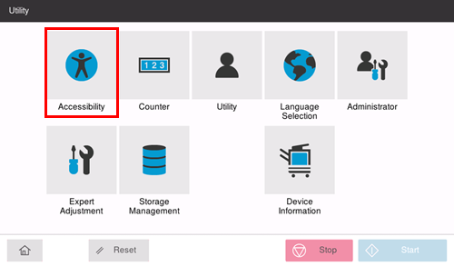 Dans [Accessibilité] d'[Utilitaires], vous pouvez spécifier des options d'accessibilité de l'environnement d'exploitation telles que le réglage de l'Écran tactile ou un changement des sons de saisie.