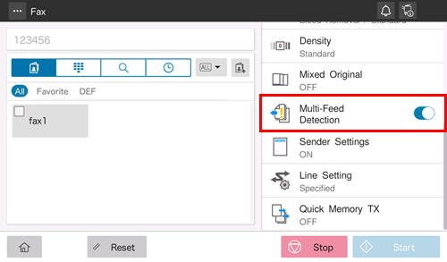 La sélection de [Détection multi-chargement] sur MARCHE arrête la numérisation lorsque la machine détecte que l'original est multiplexé sur l'ADF.