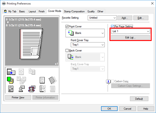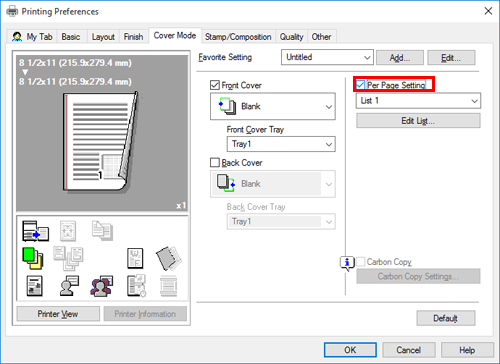 Pour imprimer les couvertures de chapitre sur un autre type de papier, cochez la case [Paramétrage par page] dans l'onglet [Mode Couverture].