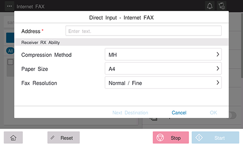 [Mode réception (Destination)] | Spécifiez la capacité du destinataire à recevoir un Fax Internet.