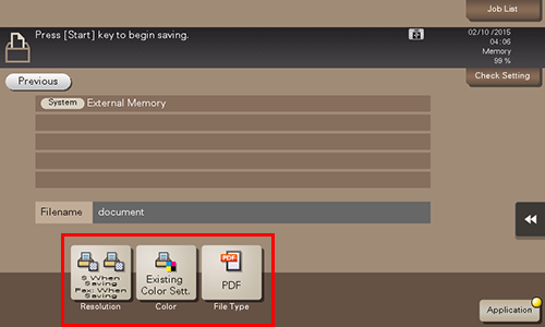Lors de l'enregistrement d'un fichier sur une mémoire USB, vous pouvez modifier les réglages d'enregistrement. Vous pouvez modifier les réglages pour [Résolution], [Couleur] et [Type Fichier].