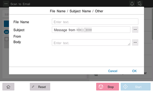 Modifiez le nom de fichier de l'original numérisé. Lorsque vous effectuez un envoi par e-mail, vous pouvez spécifier l'objet et le texte du message e-mail et modifier l'adresse e-mail de l'expéditeur (adresse de l'expéditeur).
