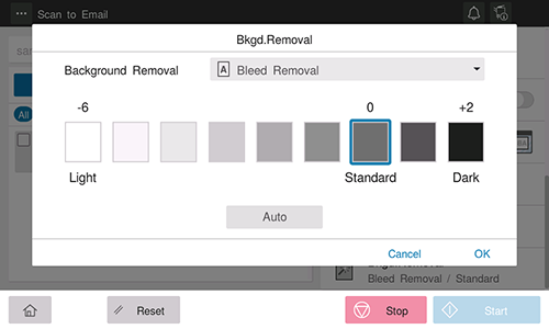 [Réglage décoloration] | Réglez la densité de la couleur du fond pour numériser un original avec fond en couleur tel qu'une carte. La sélection de [Auto] détermine automatiquement la densité de la couleur de fond et numérise un original au niveau de densité de fond optimal. |
