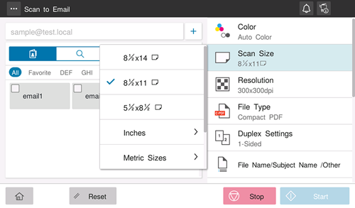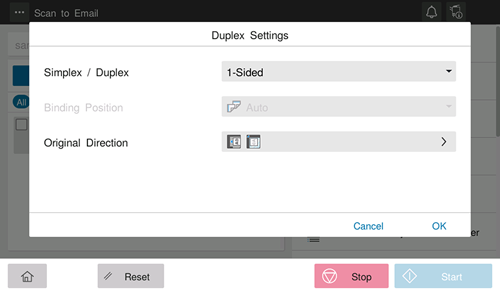 [Recto / recto-verso] | Sélectionnez la face d'original à numériser (Recto/recto-verso). |