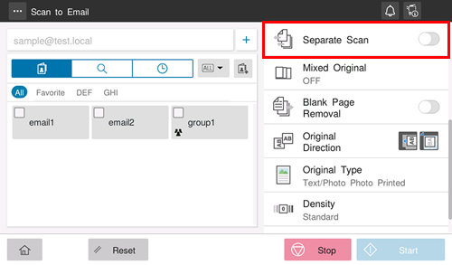 [Pages séparées] | Lorsque vous souhaitez séparer un fichier pour chaque page alors que l'original est composé de plusieurs pages, activez [Pages séparées]. Cette fonction n'est pas disponible lorsque [Type de fichier] est défini sur [JPEG]. Toutes les pages sont séparées.
