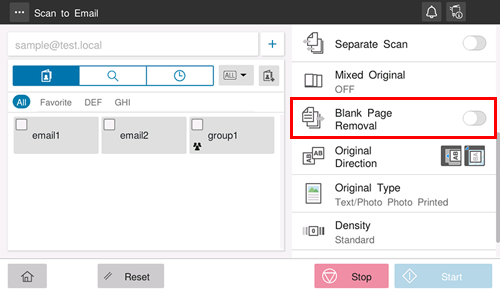 Lorsque [Supprimer pages vierges] est spécifié pour numériser un original comprenant des pages vierges à l'aide de l'ADF, les pages vierges sont exclues des cibles de numérisation. Les pages vierges détectées ne sont pas comptabilisées dans les pages d'original.