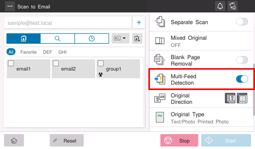 La sélection de [Détection multi-chargement] sur MARCHE arrête la numérisation lorsque la machine détecte que l'original est multiplexé sur l'ADF.