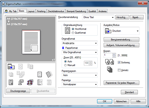 Wählen Sie auf der Registerkarte [Basis] unter [Originalformat] entweder [Umschlag] oder [Postkarte] aus.