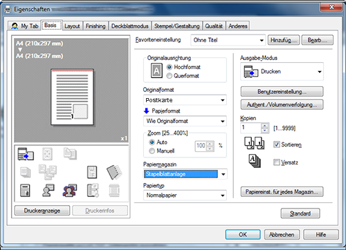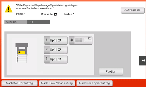 Wenn Sie nicht auf [Fertig] tippen können, überprüfen Sie, ob die Papiereinstellung des Druckertreibers mit der Einstellung des Hauptsystems übereinstimmt. Entfernen Sie außerdem Umschläge oder Postkarten aus der Stapelanlage/dem Spezialeinzug und legen Sie sie wieder ein.