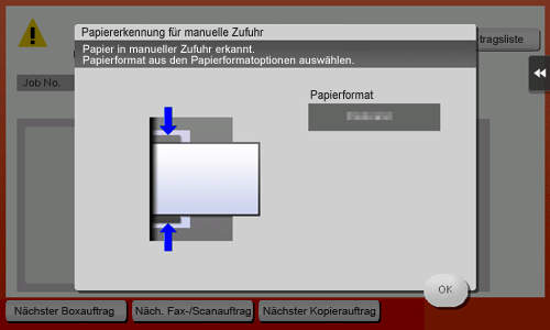 Stellen Sie sicher, dass das für die Stapelanlage/den Spezialeinzug festgelegte Papierformat dem Format des tatsächlich eingelegten Papiers entspricht, und tippen Sie dann auf [OK].
