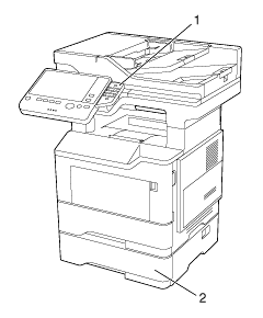 6 | Papiereinzugseinheit PF‑P15 | Hier können bis zu 250 Blatt eingelegt werden. Bis zu drei dieser Einheiten können übereinander installiert werden. |