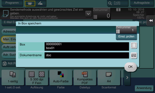 Wählen Sie eine Box aus, in der gescannte Originaldaten gespeichert werden sollen. Ändern Sie bei Bedarf den Dateinamen für die Speicherung.