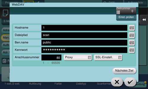 [Hostname] | Geben Sie den Hostnamen oder die IP-Adresse des WebDAV-Servers ein (max. 253 Byte lang).