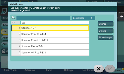 Wenn es ist schwierig ist, ein Ziel zu finden, weil zu viele Ziele vorhanden sind, tippen Sie auf [Suchen]. Wählen Sie ein Ziel aus und tippen Sie auf [Details], um die Zielinformationen zu überprüfen. Tippen Sie zur Auswahl einer Optionseinstellung auf [Einstellungen].