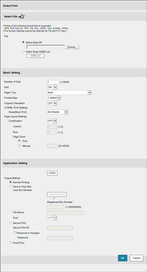 Direct Print is a function that enables you to directly send PDF (Ver.1.6), JPEG, TIFF, XPS, PS, PCL, Text, OOXML (.docx/.xlsx/.pptx), and PPML (.ppml/.vdx/.zip) files on your computer or in an SMB sharing folder to this machine to print them without using the printer driver.