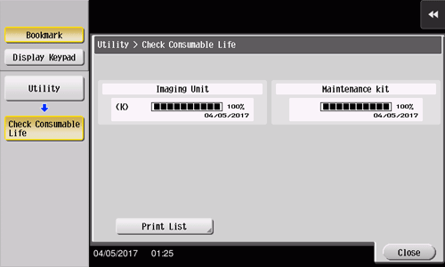 Also, users can select [Utility] - [Check Consumable Life] to display the current status of consumables (consumption level) on the screen and check it.