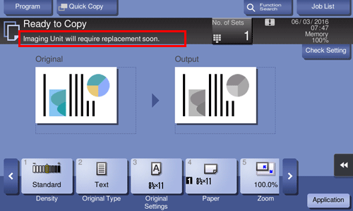When it is time to replace an Imaging Unit, a replacement prompt message appears. Replace it based on the maintenance contract. Tap [Start Guidance] to display the replacement procedure on the screen and check it.