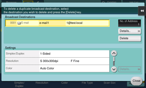 Tap [Check Setting] on the main screen of the scan/fax mode to view the specified addresses or current settings.