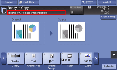 A message appears indicating the time(s) that expiring consumables used in this machine should be replaced. Also, a message appears when the Original Scan Glass is dirty.