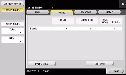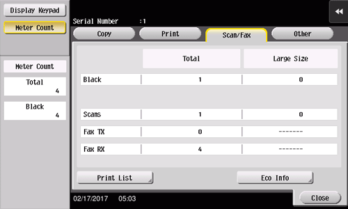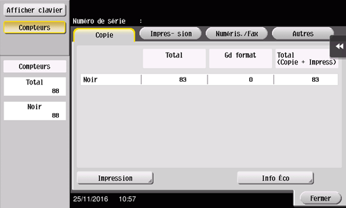 Vérifiez le nombre total de pages d'original numérisées et imprimées, le nombre total de feuilles imprimées, le nombre total de pages imprimées des deux côtés et le nombre total de pages imprimées sans tenir compte des fonctions.
