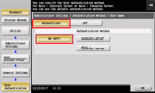 Réglez [Méthode authentification] sur [ON (MFP)], puis tapez sur [OK].
