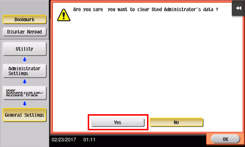 Tapez sur [Utilitaires] - [Réglages administrateur] - [Identification Utilisateur/Compte Département] - [Réglages généraux] - [Authentification].