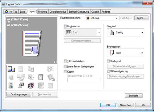 Auf der Registerkarte [Layout] können Sie die Layout-Einstellungen für den Druck einrichten. Sie können Seiten kombinieren oder die Druckpositionen anpassen.
