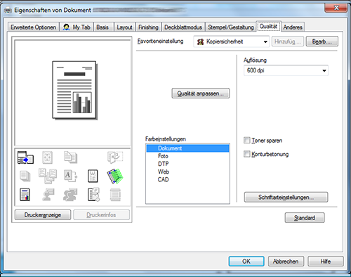 Auf der Registerkarte [Qualität] können Sie Einstellungen für die Bildqualität des Originals einrichten. Sie können die Art der Bild- und Schriftverarbeitung festlegen.