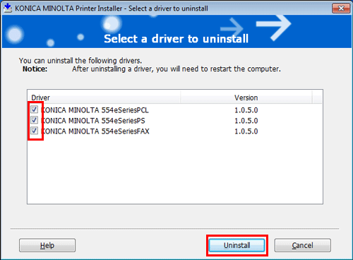 Klicken Sie im Startmenü auf [Alle Programme] (oder [Programme]) - [KONICA MINOLTA] - [554eSeries(PS_PCL_FAX)]/[554eSeries(XPS)] - [Druckertreiber deinstallieren].