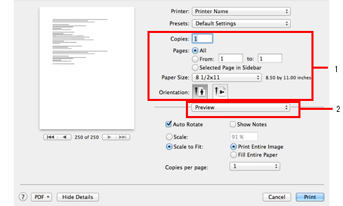 Wenn die Einstellungselemente (1) unter Mac OS X 10.7/10.8/10.9 nicht angezeigt werden, klicken Sie auf [Show Details].