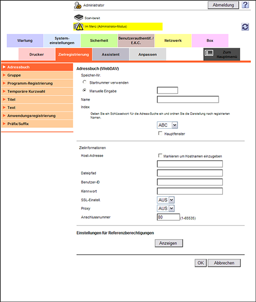 Wählen Sie im Administratormodus [Zielregistrierung] - [Adressbuch] - [WebDAV] und setzen Sie die Option [SSL-Einstell.] auf [EIN] (Standard: [AUS]).