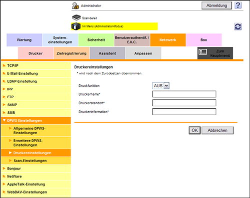 Wählen Sie im Administratormodus [Netzwerk] - [DPWS-Einstellungen] - [Druckereinstellungen] und richten Sie dann die folgenden Einstellungen ein.