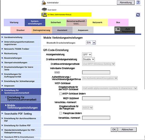 Wählen Sie im Administratormodus [Systemeinstellungen] - [Einstellung für Systemzusammenarbeit] - [Mobile Verbindungseinstellungen] und setzen Sie [Bluetooth-Druckeinstellungen] auf [EIN] (Standard: [EIN]).