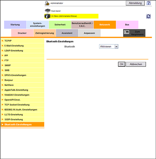 Wählen Sie im Administratormodus [Netzwerk] - [Bluetooth-Einstellungen] und setzen Sie [Bluetooth] auf [Aktivieren] (Standard: [Aktivieren]).