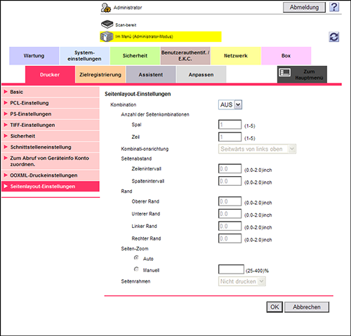Wählen Sie im Administratormodus [Drucker] - [Seitenlayout-Einstellungen] und richten Sie dann die folgenden Einstellungen ein.